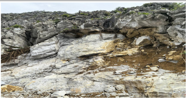 (二)+611m山頭削頂機(jī)械道路山體表面巖溶較發(fā)育,呈不規(guī)則狀小溶溝、溶槽狀分布,在地表小溶溝、溶槽內(nèi)局部堆積有少量粘土,其厚度一般為0.2~0.4m,分布不連續(xù),厚度不穩(wěn)定。區(qū)內(nèi)礦體和圍巖均為灰?guī)r,巖層節(jié)理、裂隙較發(fā)育。
