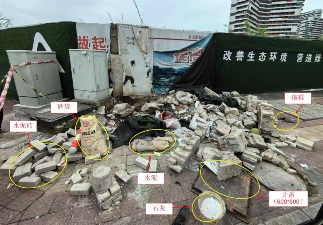 除墻體倒塌后散落的磚塊外,事故現(xiàn)場還有:一堆新的水泥磚(未使用過)、一袋砂、一袋水泥、一桶石灰、一個(gè)鑄鐵井蓋(600mm×600mm)、一雙拖鞋。見附圖5。