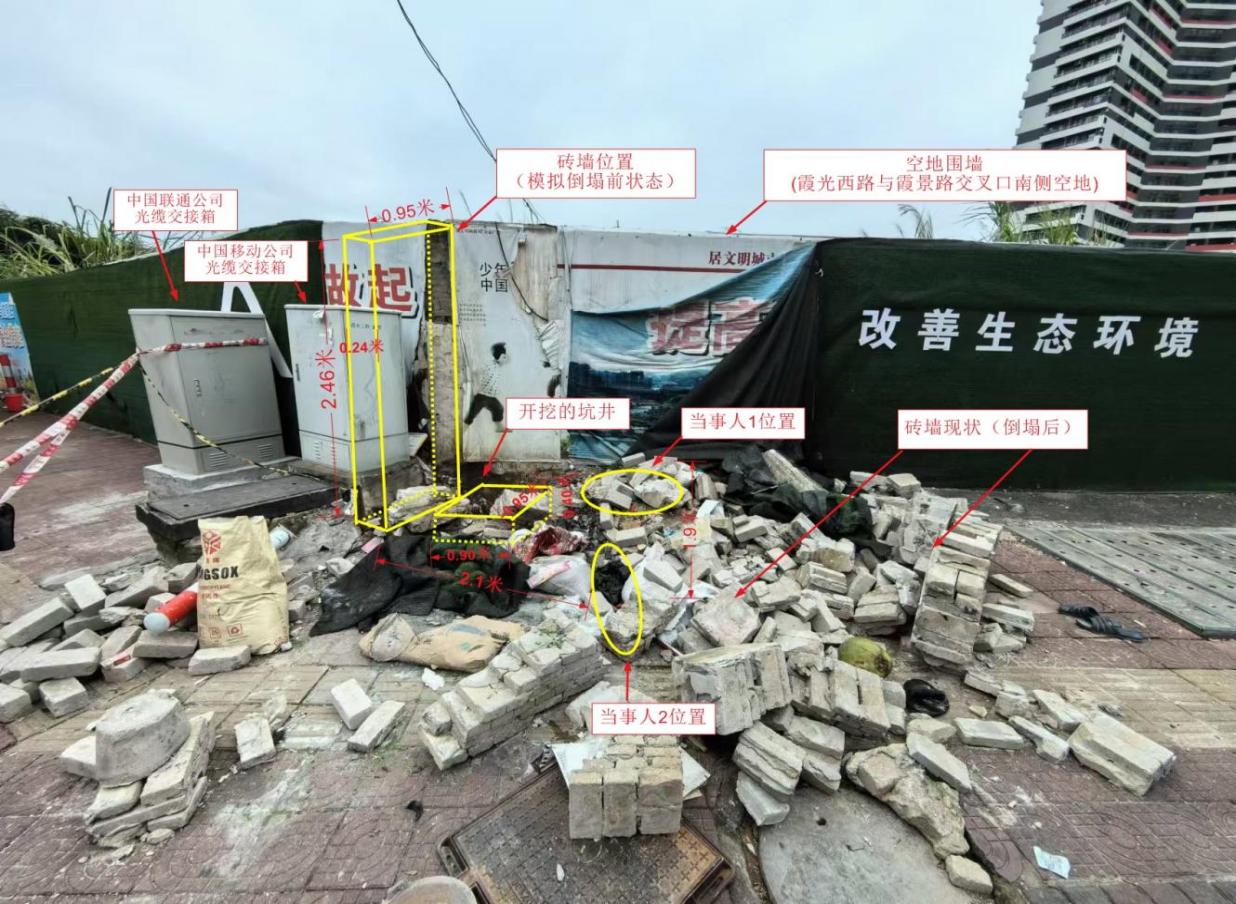 此次事故中倒塌的墻體為一段呈長方體的磚墻,該磚墻倒塌前位置:其南側(cè)緊貼南側(cè)空地圍墻,北側(cè)、西側(cè)為霞光西路,東側(cè)(背面)緊臨中國移動(dòng)公司光纜交接箱(箱體側(cè)面標(biāo)有“霞光二路光交”字樣,箱體長0.75米、寬0.55米、高1.37米),中國移動(dòng)公司光纜交接箱旁邊有一個(gè)中國聯(lián)通公司的同類型箱體(箱體長0.75米、寬0.58米、高1.43米)。見附圖3。