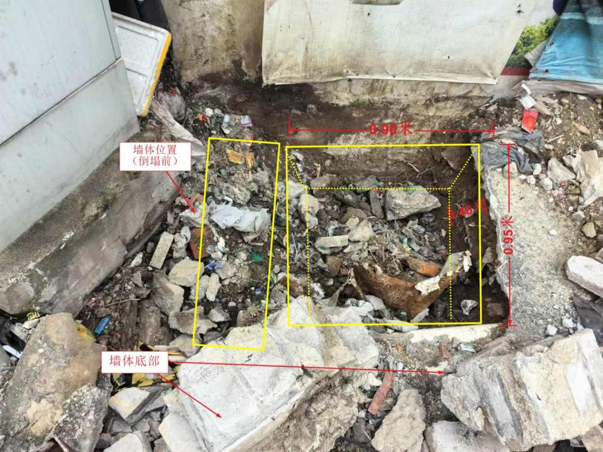 倒塌磚墻與空地圍墻交接處有已開挖的一個(gè)坑井,坑井東側(cè)緊貼倒塌磚墻墻腳,南側(cè)緊貼空地圍墻墻腳,位于水泥鋪裝面上、北側(cè)臨近人行道地磚,其尺寸長約0.95米、寬約0.90米、深約0.40米。見附圖3和附圖4。