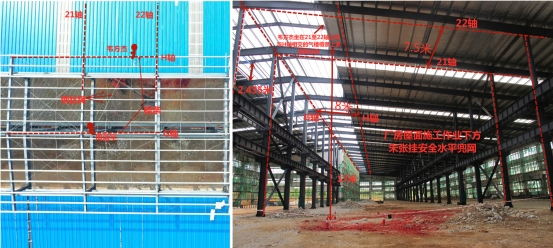 周某寧坐在氣樓G軸鋼梁上,韋某杰坐在氣樓H軸鋼梁上,兩人協(xié)作安裝鍍鋅鋼絲繩。屋面氣樓下方未張掛安全水平兜網(wǎng),氣樓邊緣與彩鋼瓦屋面高約2.435米,彩鋼瓦屋面至地面高約17米。(見圖2)