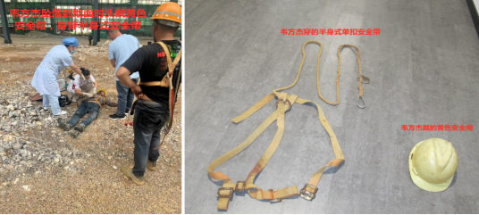 韋某杰佩戴的安全帶為半身式安全帶(無生產(chǎn)廠家、型號信息),安全帶上的安全繩及掛鉤無斷裂破損。頭上戴著黃色安全帽(無生產(chǎn)廠家、型號信息)。(見圖3)
