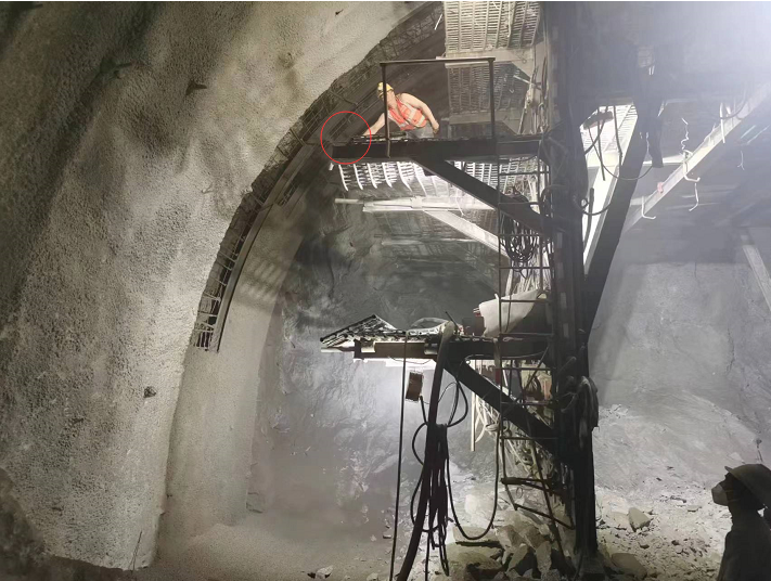事故發(fā)生在禮約隧道進口端右洞,位于雅安市石棉縣王崗坪鄉(xiāng)挖角村2組。該隧道為在建隧道,曲墻式結(jié)構(gòu),隧道高7.15m,寬11.06m。事發(fā)時右洞掌子面樁號K78+040,開累進尺1371.6m?,F(xiàn)場有一支護臺架,臺架高6m,寬10m,分三層,第一層距地面高1.6m,第二層距地面高3.2m,第三層距地面高5.2m。(附現(xiàn)場照片)