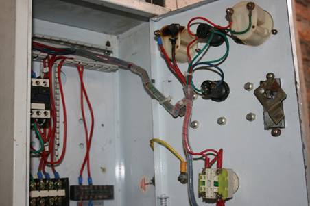 1)水泵電機(jī)控制箱上面的交流電流表已燒毀,控制水泵電機(jī)的三相電源線是從交流接觸器下端觸頭引進(jìn),從交流接觸器上端觸頭引出(正確接法應(yīng)是上進(jìn)下出)。