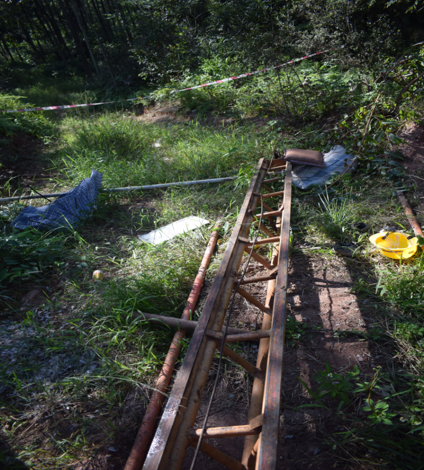 2023年9月16日13時33分許,桂達公司施工人員胡某俊、胡某軍在塔東辦事處長坑口水庫維修錨固旋樁鉆機。胡某軍在鉆機主體設(shè)備旁操作液壓升降桿將塔架放平,胡某俊配合移動塔架撐桿,在塔架放平過程中,第一節(jié)連接處螺栓突然崩脫,導(dǎo)致塔架第二節(jié)以上部分突然斷裂倒塌,倒塌的鐵架最末端中部砸到胡某俊頭部和腳部致其重傷,胡某軍立即撥打120急救電話。14時30分許,傷者胡某俊被轉(zhuǎn)移至博羅縣楊僑鎮(zhèn)衛(wèi)生院進行急救。15時15分許胡某俊經(jīng)搶救無效宣告死亡。