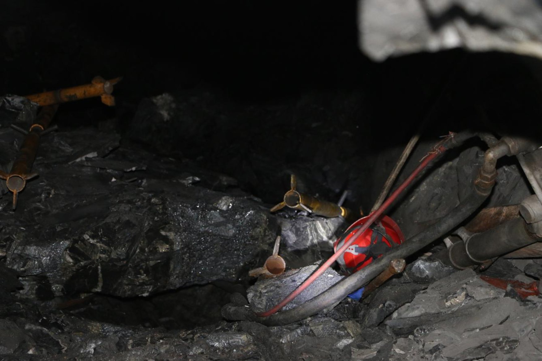 圖2:中心現(xiàn)場(chǎng)細(xì)目(冒落的塊狀礦石、被壓的管線支柱及安全帽等)