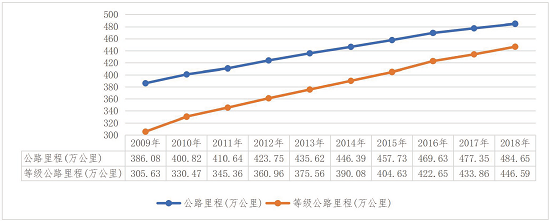 據(jù)國(guó)家統(tǒng)計(jì)局公開統(tǒng)計(jì)資料顯示,2009年至2018年10年間,國(guó)家公路里程(公路里程統(tǒng)計(jì)范圍:包括城間、城鄉(xiāng)間、鄉(xiāng)(村)間能行駛汽車的公共道路,公路通過城鎮(zhèn)街道的里程,公路橋梁長(zhǎng)度、隧道長(zhǎng)度、渡口寬度)增長(zhǎng)100萬(wàn)公里,其中等級(jí)公路增長(zhǎng)勢(shì)頭迅猛(如圖1所示),增長(zhǎng)率超過公路總里程,達(dá)到46%。