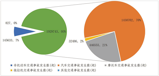 導(dǎo)致道路交通事故的原因很多,如道路因素、車輛安全性能隱患、自然條件、交通管理等等。但根據(jù)最近十年的數(shù)據(jù)匯總,由圖4可以清晰的看出,因機(jī)動(dòng)車造成的道路安全事故比例達(dá)到90%以上,其中汽車交通事故發(fā)生數(shù)更是高達(dá)75%。