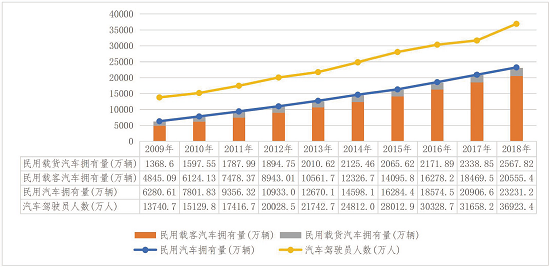 隨著國(guó)家交通基礎(chǔ)設(shè)施的日益完善,國(guó)民生活水平的不斷提高,國(guó)內(nèi)機(jī)動(dòng)車保有量、汽車駕駛員人數(shù)節(jié)節(jié)攀升。從圖2可以看出,截至2018年末,全國(guó)民用汽車保有量達(dá)2.3億輛,年增長(zhǎng)11%,更是達(dá)到10前年的3.7倍;在汽車保有量中,私人汽車保有量為2.1億輛。同期,全國(guó)機(jī)動(dòng)車駕駛?cè)?/span>4.2億人,其中汽車駕駛?cè)?/span>3.8億人,年增長(zhǎng)17%,達(dá)到10前年的2.7倍,各項(xiàng)數(shù)據(jù)均呈現(xiàn)跨越式增長(zhǎng)。