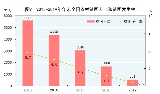 脫貧攻堅成效明顯。按照每人每年2300元(2010年不變價)的農(nóng)村貧困標(biāo)準(zhǔn)計算,年末農(nóng)村貧困人口551萬人,比上年末減少1109萬人[26];貧困發(fā)生率[27]0.6%,比上年下降1.1個百分點。全年貧困地區(qū)[28]農(nóng)村居民人均可支配收入11567元,比上年增長11.5%,扣除價格因素,實際增長8.0%。