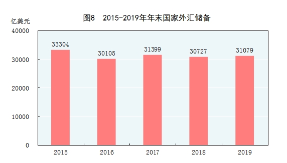 年末國家外匯儲備31079億美元,比上年末增加352億美元。全年人民幣平均匯率為1美元兌6.8985元人民幣,比上年貶值4.1%。