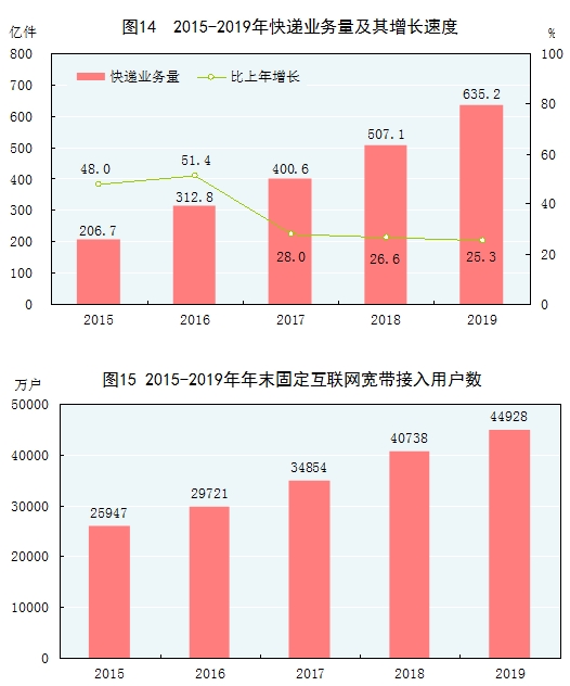 全年完成郵政行業(yè)業(yè)務(wù)總量[40]16230億元,比上年增長31.5%。郵政業(yè)全年完成郵政函件業(yè)務(wù)21.7億件,包裹業(yè)務(wù)0.2億件,快遞業(yè)務(wù)量635.2億件,快遞業(yè)務(wù)收入7498億元。全年完成電信業(yè)務(wù)總量[41]106789億元,比上年增長62.9%。年末全國電話用戶總數(shù)179238萬戶,其中移動電話用戶160134萬戶。移動電話普及率上升至114.4部/百人。固定互聯(lián)網(wǎng)寬帶接入用戶[42]44928萬戶,比上年末增加4190萬戶,其中固定互聯(lián)網(wǎng)光纖寬帶接入用戶[43]41740萬戶,增加4907萬戶。全年移動互聯(lián)網(wǎng)用戶接入流量1220億GB,比上年增長71.6%。全年軟件和信息技術(shù)服務(wù)業(yè)[44]完成軟件業(yè)務(wù)收入71768億元,按可比口徑計算,比上年增長15.4%。