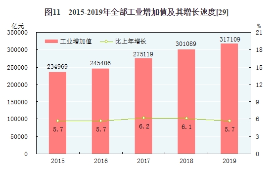 全年全部工業(yè)增加值317109億元,比上年增長5.7%。規(guī)模以上工業(yè)增加值增長5.7%。在規(guī)模以上工業(yè)中,分經(jīng)濟(jì)類型看,國有控股企業(yè)增加值增長4.8%;股份制企業(yè)增長6.8%,外商及港澳臺商投資企業(yè)增長2.0%;私營企業(yè)增長7.7%。分門類看,采礦業(yè)增長5.0%,制造業(yè)增長6.0%,電力、熱力、燃?xì)饧八a(chǎn)和供應(yīng)業(yè)增長7.0%。