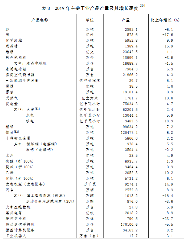 [30]2018年部分產(chǎn)品產(chǎn)量數(shù)據(jù)根據(jù)第四次全國經(jīng)濟(jì)普查結(jié)果進(jìn)行了修訂,2019年產(chǎn)量增速按可比口徑計算。
