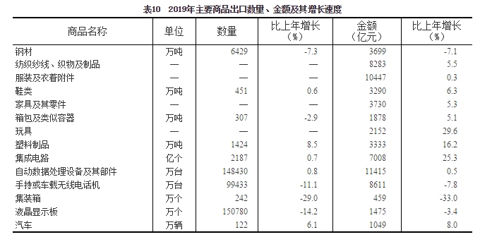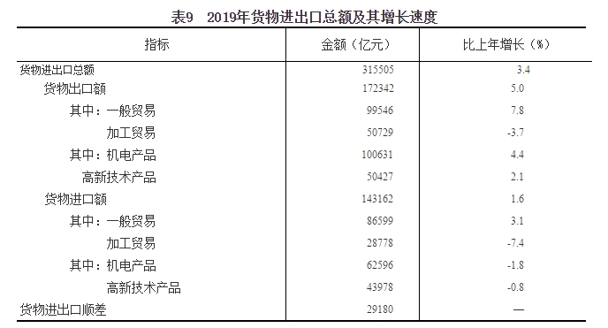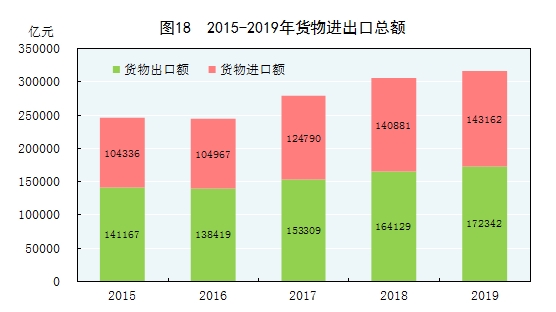 全年貨物進(jìn)出口總額315505億元,比上年增長3.4%。其中,出口172342億元,增長5.0%;進(jìn)口143162億元,增長1.6%。貨物進(jìn)出口順差29180億元,比上年增加5932億元。對“一帶一路”[52]沿線國家進(jìn)出口總額92690億元,比上年增長10.8%。其中,出口52585億元,增長13.2%;進(jìn)口40105億元,增長7.9%。