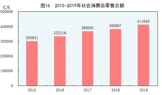 全年社會消費(fèi)品零售總額411649億元,比上年增長8.0%。按經(jīng)營地統(tǒng)計,城鎮(zhèn)消費(fèi)品零售額351317億元,增長7.9%;鄉(xiāng)村消費(fèi)品零售額60332億元,增長9.0%。按消費(fèi)類型統(tǒng)計,商品零售額364928億元,增長7.9%;餐飲收入額46721億元,增長9.4%。