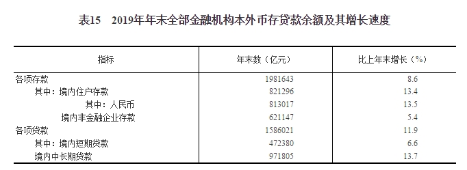 全年社會融資規(guī)模增量[54]25.6萬億元,按可比口徑計算,比上年多3.1萬億元;年末社會融資規(guī)模存量[55]251.3萬億元,按可比口徑計算,比上年末增長10.7%,其中對實體經(jīng)濟(jì)發(fā)放的人民幣貸款余額151.6萬億元,增長12.5%。年末全部金融機(jī)構(gòu)本外幣各項存款余額198.2萬億元,比年初增加15.7萬億元,其中人民幣各項存款余額192.9萬億元,增加15.4萬億元。全部金融機(jī)構(gòu)本外幣各項貸款余額158.6萬億元,增加16.8萬億元,其中人民幣各項貸款余額153.1萬億元,增加16.8萬億元。