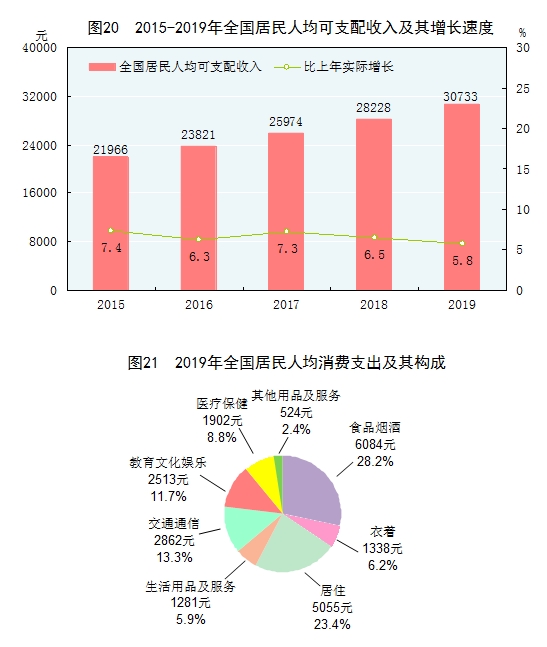 全年全國居民人均可支配收入30733元,比上年增長8.9%,扣除價格因素,實際增長5.8%。全國居民人均可支配收入中位數(shù)[60]26523元,增長9.0%。按常住地分,城鎮(zhèn)居民人均可支配收入42359元,比上年增長7.9%,扣除價格因素,實際增長5.0%。城鎮(zhèn)居民人均可支配收入中位數(shù)39244元,增長7.8%。農(nóng)村居民人均可支配收入16021元,比上年增長9.6%,扣除價格因素,實際增長6.2%。農(nóng)村居民人均可支配收入中位數(shù)14389元,增長10.1%。按全國居民五等份收入分組[61],低收入組人均可支配收入7380元,中間偏下收入組人均可支配收入15777元,中間收入組人均可支配收入25035元,中間偏上收入組人均可支配收入39230元,高收入組人均可支配收入76401元。全國農(nóng)民工人均月收入3962元,比上年增長6.5%。