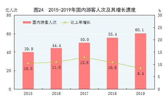 全年國內(nèi)游客60.1億人次,比上年增長8.4%;國內(nèi)旅游收入57251億元,增長11.7%。入境游客14531萬人次,增長2.9%。其中,外國人3188萬人次,增長4.4%;香港、澳門和臺灣同胞11342萬人次,增長2.5%。在入境游客中,過夜游客6573萬人次,增長4.5%。國際旅游收入1313億美元,增長3.3%。國內(nèi)居民出境16921萬人次,增長4.5%。其中因私出境16211萬人次,增長4.6%;赴港澳臺出境10237萬人次,增長3.2%。