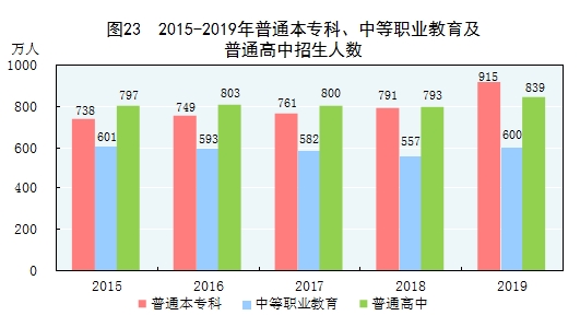 全年研究生教育招生91.7萬人,在學(xué)研究生286.4萬人,畢業(yè)生64.0萬人。普通本專科招生914.9萬人,在校生3031.5萬人,畢業(yè)生758.5萬人。中等職業(yè)教育[70]招生600.4萬人,在校生1576.5萬人,畢業(yè)生493.4萬人。普通高中招生839.5萬人,在校生2414.3萬人,畢業(yè)生789.2萬人。初中招生1638.8萬人,在校生4827.1萬人,畢業(yè)生1454.1萬人。普通小學(xué)招生1869.0萬人,在校生10561.2萬人,畢業(yè)生1647.9萬人。特殊教育招生14.4萬人,在校生79.5萬人,畢業(yè)生9.8萬人。學(xué)前教育在園幼兒4713.9萬人。九年義務(wù)教育鞏固率為94.8%,高中階段毛入學(xué)率為89.5%。
