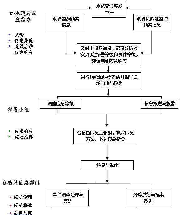 部應(yīng)急辦負(fù)責(zé)水路交通突發(fā)事件應(yīng)急值守、信息匯總和上報(bào),負(fù)責(zé)重、特大突發(fā)事件信息收集、流轉(zhuǎn)、報(bào)送工作。水運(yùn)局負(fù)責(zé)應(yīng)急處置和續(xù)報(bào)信息的提供、核簽工作。