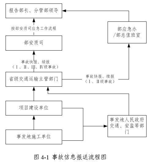 事發(fā)地省級交通運輸主管部門應急聯(lián)絡員或值班部門接報事故后,應當立即口頭或短信報告部安質司應急聯(lián)絡員或部安質司責任處室相關人員,并按照《交通運輸行業(yè)建設工程生產(chǎn)安全事故統(tǒng)計報表制度》要求,在1小時內將信息上報至部安質司,其中Ⅰ、Ⅱ級事故還應按照《交通運輸突發(fā)事件信息報告和處理辦法》的要求上報部應急辦,并及時續(xù)報相關情況。事故信息報送流程如圖4-1所示。