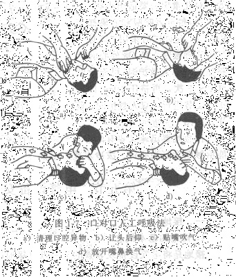 ?。?)口對口人工呼吸法是在觸電者呼吸停止后應(yīng)用的急救方法。具體步驟如下: