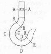 ??? 61、起重機(jī)械吊鉤的斷裂可能導(dǎo)致重大的人身及設(shè)備事故。吊鉤受力比較復(fù)雜,磨損比較大。吊鉤檢驗(yàn)中,必須了解吊鉤的危險(xiǎn)斷面的所在位置。下圖中,吊鉤的危險(xiǎn)斷面位置包括()。