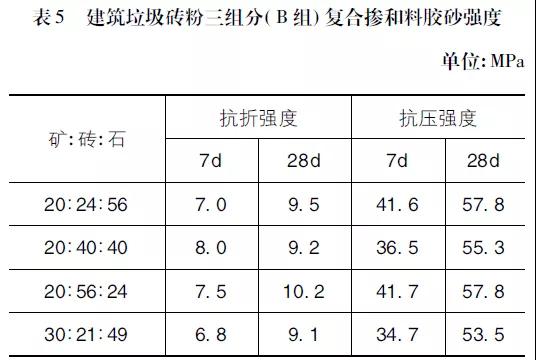 2.2 建筑垃圾磚粉三組分復(fù)合摻和料膠砂配合比與強(qiáng)度