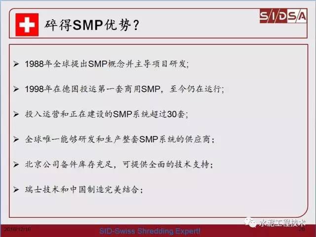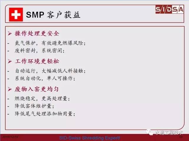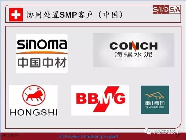 分會戰(zhàn)略合作伙伴碎得機(jī)械(北京)有限公司韓建松經(jīng)理在中國硅酸鹽學(xué)會工程技術(shù)分會、建筑材料工業(yè)技術(shù)情報(bào)研究所主辦的“2016中國水泥技術(shù)年會”上的關(guān)于“碎得SMP系統(tǒng)水泥窯協(xié)同處置應(yīng)用”的精彩報(bào)告。碎得機(jī)械(北京)有限公司目前在國內(nèi)擁有中材國際、海螺、金隅、紅獅、重山集團(tuán)、同力等客戶,在國際上擁有拉法基-豪瑞等客戶,是優(yōu)秀的協(xié)同處置系統(tǒng)設(shè)備供應(yīng)商。行業(yè)品牌,值得信賴。