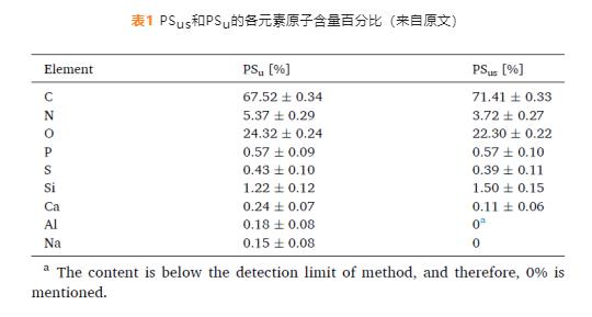 PSus和PSu中C、O、N和P的含量差異較小,PSus中金屬含量顯著降低(Al:0.18% →0;Na:0.15% →0;Ca:0.24% →0.11%),可能是由于CTAB與剩余污泥中的金屬離子發(fā)生作用,CTAB作為污泥細(xì)胞表面化學(xué)修飾劑,替代細(xì)胞表面疏水陰離子基團(tuán),結(jié)合細(xì)胞表面的陽離子(Al3+、Ca2+、Na+)。值得說明的是,EPS中含有的無機(jī)物如金屬鹽類常常被研究者所忽視,無機(jī)物的存在將影響PSs的理化性質(zhì),故PSus可能比PSu具有更優(yōu)越的性能。