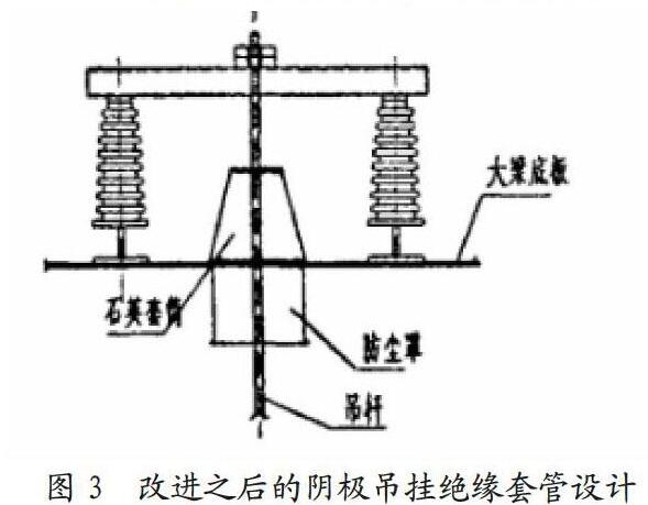 考慮到煙氣溫度較高且粉塵比電阻低、容易爬電的特點,在陰極吊掛設(shè)計的時候應(yīng)用了一種耐高溫能力強、不容易累積灰塵、爬距大的95瓷制作穿墻套管,具體如圖2所示。設(shè)計好的陰極吊掛在經(jīng)過一段時間的試用之后發(fā)現(xiàn)效果不理想,幾處穿墻套管在電場內(nèi)部,在受到擊打會出現(xiàn)炸裂的現(xiàn)象,炸裂之后的零碎品會掉落到灰斗的內(nèi)部,使得焦化爐的使用出現(xiàn)了不同程度的損壞。針對這個問題,在改進設(shè)計中相關(guān)人員替換掉了穿墻套管,將穿墻套管替換為一種耐高溫的石英套管,并在大梁上使用的時候在外部額外添加防塵套,改進之后的陰極吊掛絕緣套管如圖3所示。改進之后的陰極吊掛絕緣套管能夠?qū)⒎蹓m到達瓷套的量有效降低,減少爬電現(xiàn)象的發(fā)生。