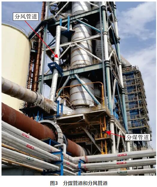 (2)分煤、分風(fēng)、分料系統(tǒng):分煤系統(tǒng)(見圖3)是在分解爐錐部新增設(shè)4根送煤管道,配套增加低氮燃燒器,并將上部原有送煤管道變細(xì),確保所有送煤管道通風(fēng)截面之和與改前保持一致,保證送煤風(fēng)速。主管道一分為二配置2個(gè)電動控制閥,保證精確控制分煤量,使尾煤充分布滿煙道空間,強(qiáng)化分解爐中下部的還原氛圍。