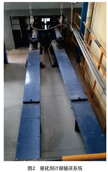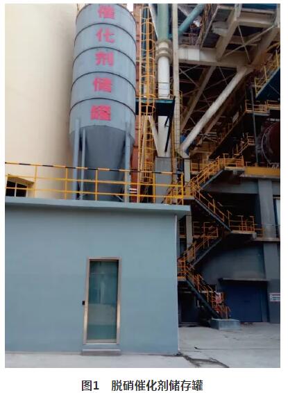 (1)催化劑儲存和計(jì)量輸送系統(tǒng):采用100 m3鋼板倉儲存脫硝催化劑,并在倉頂增設(shè)收塵裝置。催化劑經(jīng)倉底計(jì)量系統(tǒng)后送入均化庫底到入窯斗式提升機(jī)的斜槽內(nèi)。脫硝催化劑儲存罐見圖1,催化劑計(jì)量輸送系統(tǒng)見圖2。