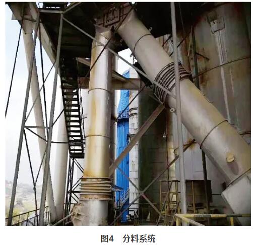 分料系統(tǒng)(見圖4):配置三通、下料管道等,分料量約為20%~30%,既控制分解爐錐部溫度,同時(shí)增大了生料的分解空間。