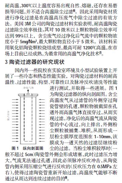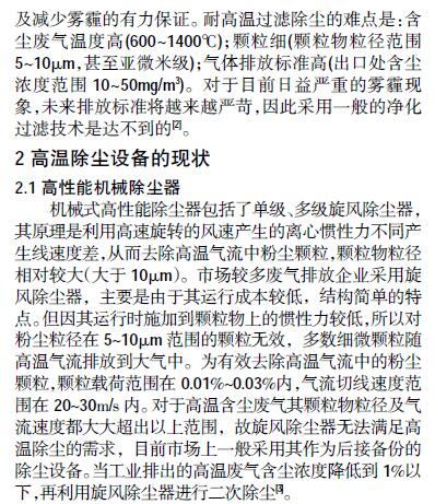 在我國(guó)目前的工業(yè)能源布局體系中,涉及高溫含塵廢氣領(lǐng)域較多,高溫除塵材料的應(yīng)用范圍十分廣泛,如煤炭、鋼鐵、水泥等行業(yè)。上世紀(jì)70 年代左右時(shí)間,高溫氣體除塵技術(shù)的研究開(kāi)始發(fā)展,最初階段采用除塵方式多為水噴淋濕法除塵,即先將工廠排出的高溫含塵廢氣進(jìn)行水洗噴淋冷卻,降低廢氣的溫度,水洗進(jìn)行除塵,顆粒物與水一同排出。這樣既浪費(fèi)了大量熱能又浪費(fèi)水資源,造成二次污染。因此為能夠?qū)崿F(xiàn)對(duì)高溫含塵廢氣的綜合利用及粉塵顆粒過(guò)濾凈化,必須采用直接除塵過(guò)濾的方式,使用過(guò)濾介質(zhì)進(jìn)行氣固分離。由于在高溫、高濃度、高腐蝕廢氣中工作,因此對(duì)過(guò)濾材料具有很高的性能要求,過(guò)濾介質(zhì)的材料選擇是其中研發(fā)的技術(shù)關(guān)鍵,這需要采用目前國(guó)際上較先進(jìn)的耐高溫除塵濾料,并必須滿(mǎn)足過(guò)濾性、使用壽命、節(jié)能環(huán)保、市場(chǎng)接受能力等多方面的要求。