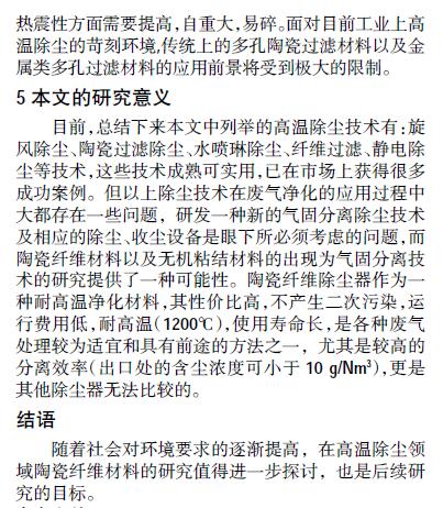 摘要:建材、冶金、電力等行業(yè)所排放出來(lái)的各類(lèi)廢氣不僅含有大量的顆粒物并且溫度較高(300度以上),同時(shí)對(duì)周邊造成污染,是造成目前霧霾多發(fā)現(xiàn)象的主要因素之一,但目前國(guó)內(nèi)300度以上的高溫介質(zhì)過(guò)濾式除塵器的工業(yè)應(yīng)用基本還是空白。陶瓷材料具有優(yōu)良的熱穩(wěn)定性和化學(xué)穩(wěn)定性,原料來(lái)源廣泛,價(jià)格低廉,成為開(kāi)發(fā)研制耐高溫濾料的首選材料。但陶瓷過(guò)濾材料或是由于材料的抗堵塞性能差,或是由于機(jī)械強(qiáng)度低等因素,限制了陶瓷過(guò)濾材料在高溫?zé)煔鈨艋I(lǐng)域的應(yīng)用。而陶瓷纖維過(guò)濾材料具有高孔隙率、耐腐蝕強(qiáng)、耐高溫、機(jī)械強(qiáng)度好等優(yōu)點(diǎn)。