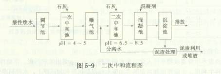投藥中和的處理設(shè)備主要由藥劑配制設(shè)備和處理構(gòu)筑物兩部分組成,流程見圖1-1。 由于軋鋼廢水中存在大量的二價鐵離子,中和產(chǎn)生的h(OH):溶解度較高,沉淀不徹底,采用曝氣方式使二價鐵變成三價鐵沉淀,出水效果好,而且沉泥也較易脫水,如圖5-9的流程所示。過濾中和就是使酸性廢水通過堿性固體濾料層進行中和。濾料層一般采用石灰石和白云石。過濾中和只適用于水量較小的軋鋼廠。