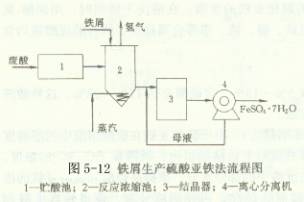 (3)加鐵屑生產(chǎn)硫酸亞鐵法 將鐵屑加入廢酸中,鐵屑與其中的游離酸反應生成硫酸亞鐵,工藝流程見圖5-12。