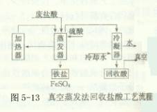 (2)真空蒸發(fā)法 真空蒸發(fā)法是利用真空蒸發(fā)裝置,在低溫下使游離鹽酸變?yōu)闅庀?,而后采用冷凝回收得到酸,氯化亞鐵則結(jié)晶析出,其工藝流程見圖5-13。