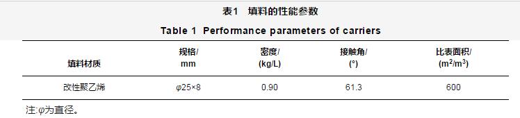 反硝化MBBR裝置采用有機玻璃制成。反應(yīng)器為圓柱型,內(nèi)徑0.25 m,高0.25 m,有效體積為12 L(圖1)。其中填充本課題組研發(fā)的液相氧化-水浴接枝丙烯酸改性聚乙烯填料[13],填料性能參數(shù)見表1。