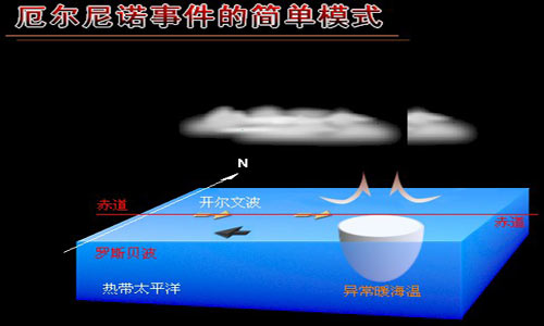 ????后來(lái),在科學(xué)上此詞語(yǔ)用于表示在秘魯和厄瓜多爾附近幾千公里的東太平洋海面溫度的異常增暖現(xiàn)象。當(dāng)這種現(xiàn)象發(fā)生時(shí),大范圍的海水溫度可比常年高出3-6攝氏度。太平洋廣大水域的水溫升高,改變了傳統(tǒng)的赤道洋流和東南信風(fēng),導(dǎo)致全球性的氣候反常。