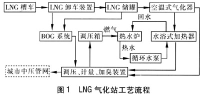 通過公路或鐵路運輸將LNG從生產(chǎn)廠或儲存基地運送到LNG氣化站,利用站內(nèi)的卸車增壓氣化器將LNG槽車內(nèi)的氣相壓力升高,將LNG通過管道卸至站內(nèi)低溫儲罐。在LNG氣化站向城市管網(wǎng)供氣時,利用站內(nèi)儲罐配套的自增壓氣化器,將低溫儲罐壓力升至LNG氣化站工作壓力,一般為0.6MPa,利用這個壓力將LNG送入空溫式氣化器,通過與環(huán)境空氣的熱量交換將液態(tài)的LNG氣化為氣態(tài)天然氣。如果此時氣態(tài)天然氣的溫度不低于5℃,那么可以通過旁通回路直接送入調(diào)壓、計量、加臭裝置。如果此時的氣態(tài)天然氣溫度低于5℃,就需要經(jīng)過水浴式加熱器將氣態(tài)天然氣加熱到5℃以上,再送入調(diào)壓、計量、加臭裝置。然后,通過站內(nèi)的調(diào)壓、計量、加臭裝置將天然氣調(diào)壓、計量、加臭后送入城市中壓管網(wǎng),為用戶供氣。LNG氣化站工藝流程見圖1。