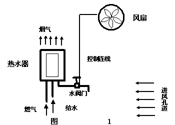 ??? 對(duì)建筑的要求:這種熱水器功率小,煙氣允許直接排到室內(nèi),但是要求建筑有足夠的空間與通風(fēng)換氣次數(shù)(參1)。由于我國家庭廚房面積不大,冬季通風(fēng)換氣次數(shù)少,容易出問題。有條件時(shí),裝一個(gè)軸流風(fēng)扇并與燃?xì)鉄崴鲉?dòng)閥并聯(lián),啟動(dòng)熱水器時(shí),風(fēng)機(jī)同時(shí)啟動(dòng),保證足夠的排煙與供氣(見圖1)。這種方式在日本也是通用的。