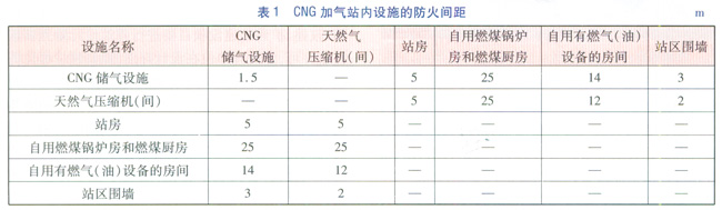按規(guī)范GB 50156—2012中表5.0.13-1的規(guī)定,CNG加氣站內(nèi)設施的防火間距見表1。