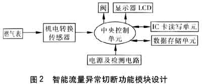 中央控制單元是安全智能燃?xì)獗淼暮诵?。通過IC卡讀寫單元將民用燃?xì)猱惓A髁繀?shù)傳入燃?xì)獗淼闹醒肟刂茊卧?,并保存到?shù)據(jù)存儲單元中,作為異常流量的判斷依據(jù)。當(dāng)前的瞬時(shí)流量信號從燃?xì)獗硗ㄟ^機(jī)電轉(zhuǎn)換傳感器讀入到中央控制單元后,由中央控制單元計(jì)算出當(dāng)前燃?xì)獗淼乃矔r(shí)流量值,并與異常流量范圍進(jìn)行比較。當(dāng)確認(rèn)流量異常時(shí),中央控制單元發(fā)出關(guān)閥操作信號,閥門關(guān)閉,顯示器顯示異常提示,并形成記錄,通過TC卡或無線形式反饋到管理系統(tǒng),供故障分析。