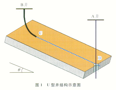 U型井技術即U型水平連通井技術,該技術集成了水平井技術、水平井與洞穴井的連通以及欠平衡鉆井和地質導向等技術,煤層氣u型井組由1口直井和1口或多口水平井組成(圖1)。U型井可采用套管完井方案,在排采后期遇到煤粉堵塞通道可下鉆修井,重新打開裂隙通道恢復開采,延長煤層氣井的壽命。
