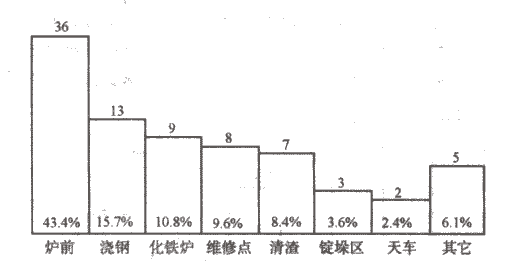 據(jù)統(tǒng)計(jì),轉(zhuǎn)爐作業(yè)區(qū)共發(fā)生工傷事故46人次,其中爐下清渣10起(占21.7%),爐體維修6起(占13%),爐前平臺19起(占41.3%),上部平臺4起(占8.8%),砌爐過程中7起(15.2%)。
