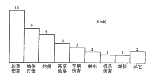 1965~2001年,轉(zhuǎn)爐煉鋼廠共發(fā)生工傷事故332起,其傷害種類分布如圖1。