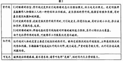 焊接弧光輻射主要是紫外線、紅外線、可見光的輻射。危害見下表2。